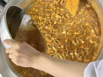 シチューやハヤシライスに使用するルウは給食室で手作りしています。今日の給食のハヤシライスは小麦粉をサラダ油(綿実油)でよく炒めてブラウンルウを作りました。