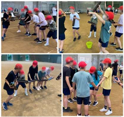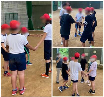 もう一つのゲームは、グループで輪になって手をつなぎ、フラフープを回すゲーム(これも聞いてみてください)。タイムを競いました。手をつないでくぐるので、なかなか難しいです。自分だけでなく、仲間がくぐりやすくなるように工夫してあげることがポイントです。いろいろ話し合って工夫していました。