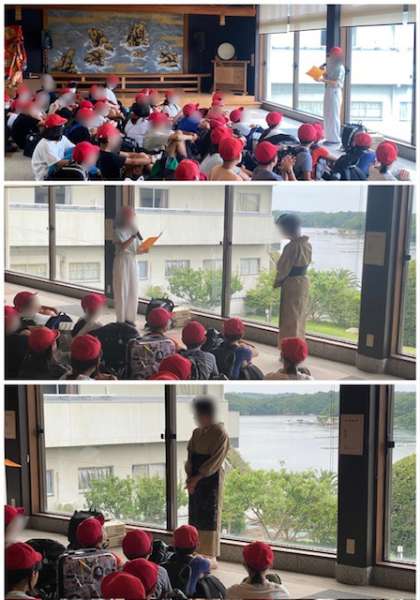 閉舎式を行いました。美味しいお食事や広いお風呂、きれいな景色、旅館の方に感謝の気持ちを伝えました。「家族でも泊まりたい」「また来たいです」「ほんとうにありがとうございました」感謝の気持ちを口々にして、宿舎を後にしました。