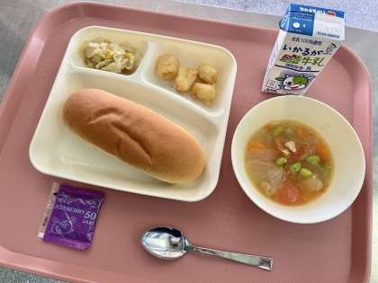 6月27日(火)の献立は「コッペパン(ブルーベリージャム)・牛乳・いかてんぷら・フレッシュトマトのスープ煮・キャベツとコーンのソテー」でした。