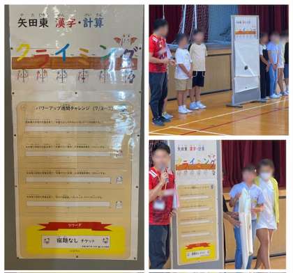 今週は、矢田東漢字・計算クライミングのパワーアップ週間です。今回のパワーアップ週間では、全校児童で、四つの目標達成を目指します。四つ全ての目標が達成されたら・・・。