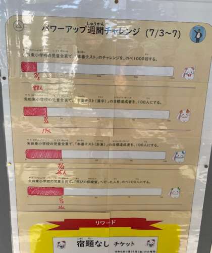パワーアップ週間チャレンジが始まりました。四つの目標が、それぞれどこまで進んでいるかわかりやすく玄関に表示されています。さあ、パワーアップ週間で、この四つの帯が全て赤に染まるでしょうか?