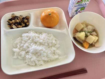 7月6日(木)の献立は「ごはん・牛乳・鶏肉と野菜の煮もの・ひじき豆・冷凍みかん」でした。