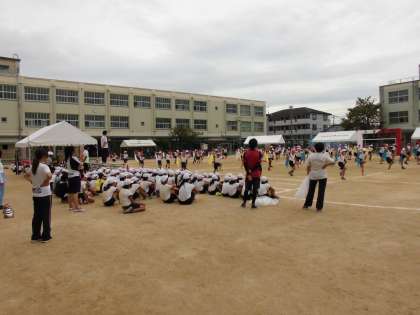 今日の全体練習は団体演技の見合いを行いました。1・2年、3・4年、5年、6年の順で本番と同じように演技を行い、たくさんの拍手をもらいました。他の学年の人に見てもらうので少し緊張したようでしたが、子どもたちのやる気とがんばりが感じられました。運動会当日も期待しています。