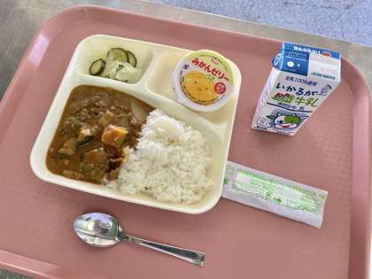 7月12日(火)の献立は「夏野菜のカレーライス・牛乳・キャベツときゅうりのサラダ・みかんゼリー」でした。