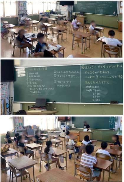 ?2年生の様子です。平和について考えるにあたって、大事な日付があります。12・8、7・26、8・6、8・9、8・15。それぞれ何の日かわかりますか。