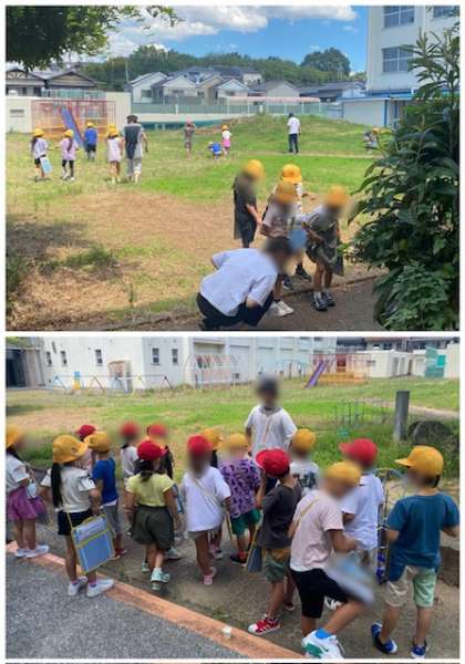 生活科で中庭を探検していました。草の間を何がいるのか、みんなで調べていましたよ。