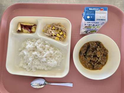 9月5日(火)の献立は「ごはん・牛乳・マーボーなす・ツナと野菜のいためもの・焼きさつまいもの甘みつかけ」でした。