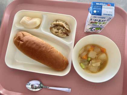 9月8日(金)の献立は「黒糖パン・牛乳・あげぎょうざ・鶏肉ととうがんの中華煮・なし(二十世紀)」でした。
