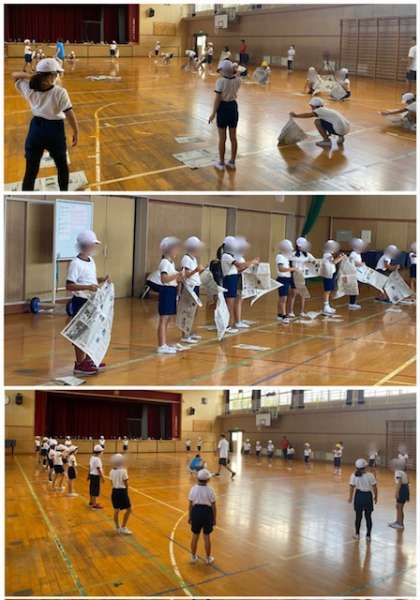 それが、サンバのリズムが流れると、身体が動き出しました。気分もあがってくると、次は新聞紙を曲に合わせて破っていく動き。細かく破る、大きく破る、リズムに合わせて楽しく活動しました。授業が終わるころには、みんなの顔が笑顔であふれていました。「サンバのリズムが楽しかった」「もっと踊りたかった」という感想が口々に出ていました。