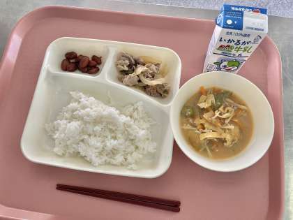 9月20日(水)の献立は「ごはん・牛乳・豚肉の甘辛焼き・とうがんのみそ汁・金時豆の煮もの」でした。