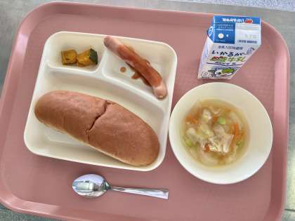 9月21日(木)の献立は「黒糖パン・牛乳・ウインナーのケチャップソース・スープ・焼きかぼちゃ」でした。