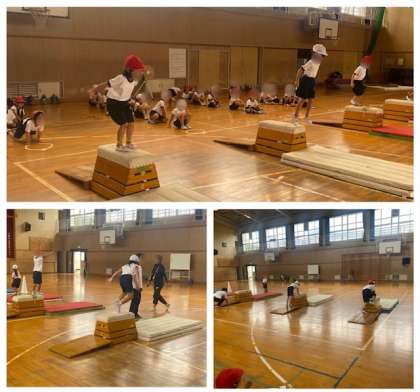 1年生は、跳び箱運動につながる動きに取り組んでいました。まずは、跳び箱に跳び乗って跳びおりる動きから。次は手をついて跳び乗る。