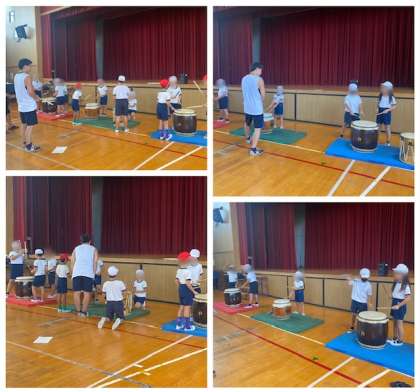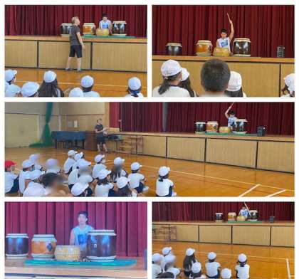 先日出前授業で来ていただいた、たいこグループの方が今度はたいこの叩き方を指導に来てくださいました。基本的なリズムから、音楽に合わせたリズム打ちと、子どもたちは身を乗り出して魅入っていました。