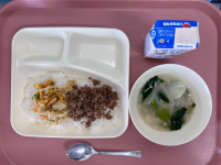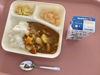 9月27日(水)の献立は「ごはん・牛乳・チキンカレーライス[米粉]・キャベツとコーンのサラダ・白桃(カット缶)」でした。