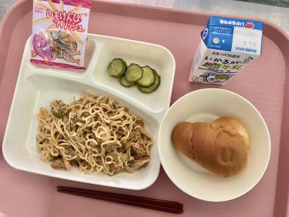 9月28日(木)の献立は「1/2黒糖パン・牛乳・焼きそば・きゅうりのしょうがづけ・いもけんぴフィッシュ」でした。