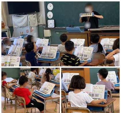 どこからか鍵盤ハーモニカのきれいな音色が響いてきました。「どこから聴こえてくるのかな?」と2階に上がると、1年生が鍵盤ハーモニカで練習をしていました。