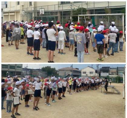 今朝は児童集会がありました。いつもは中庭も使うのですが、中庭は剪定作業中でしたので、全員で運動場を使いました。