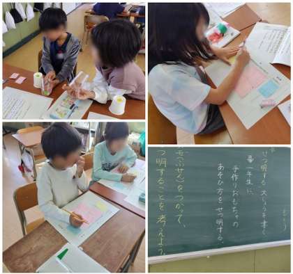 2年生では国語科で「あそび方をせつ明しよう」の学習をしています。10月31日に予定している「おもちゃランド」に向けて、1年生に分かりやすく説明するにはどうすればよいかを考えました。みんなとっても熱心です。