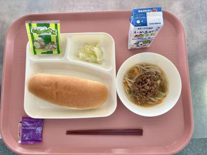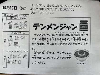 10月17日(火)の献立は「コッペパン(ブルーベリージャム)・牛乳・タンタンめん・あっさりキャベツ・まっ茶大豆」でした。