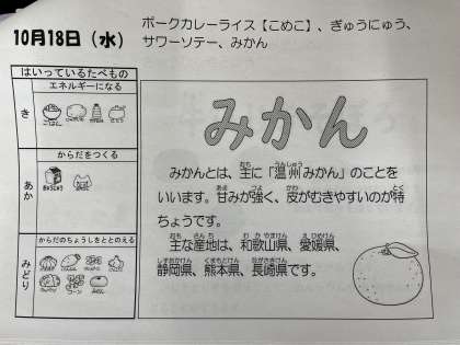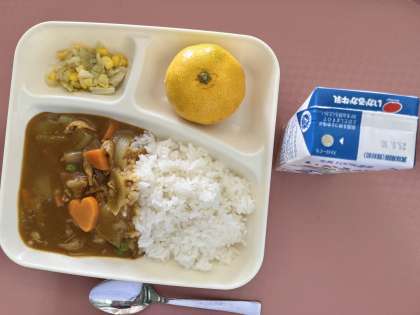 10月18日(水)の献立は「ポークカレーライス[米粉]・牛乳・サワーソテー・みかん」でした。