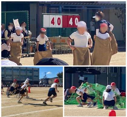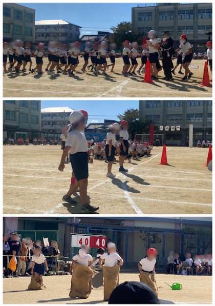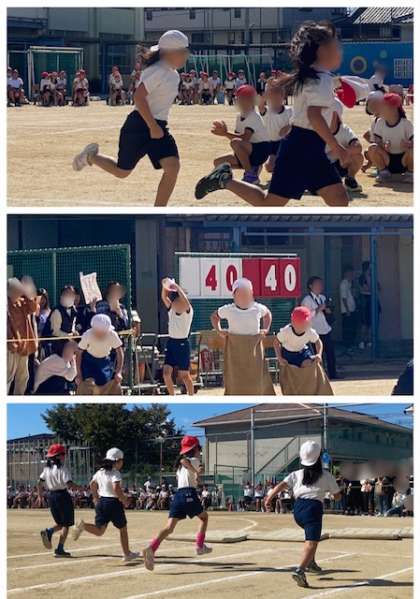 2年生のかけっこは「スティープルチェイス」、障害物競走でした。マットで前転して、網をくぐり、フラフープをぬけ、最後はドンゴロス。真剣に、笑いもとり、しっかり走りました。