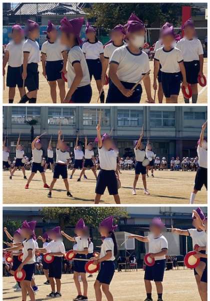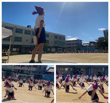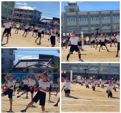 5年生は「矢田東エイサー2023」て、沖縄の民舞エイサーを踊りました。サージ(紫の布)を頭に巻き、パーランクー(沖縄の太鼓)をたたきました。「イヤーサーサー」の掛け声もそろえて、かっこよく踊りきりました。