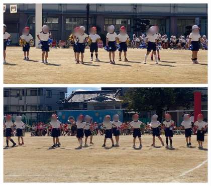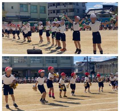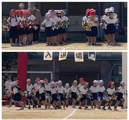 1年生の団体演技は「きらきらアドベンチャー」です。両手にキラキラのぽんぽんを持って、元気にかわいらしく、キラキラ踊りました。最後のグループでのポーズはバッチリ決まりました。