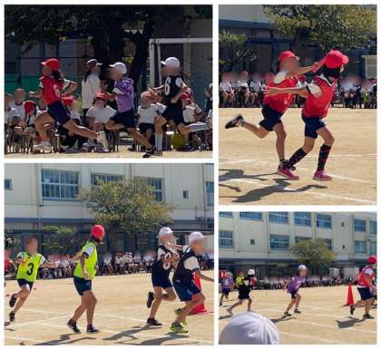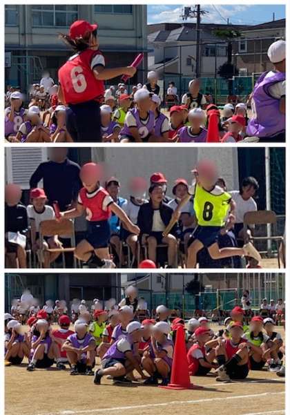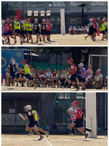 4年生「バトンをつなげGo 4 it!」、半周ずつのリレーです。コーナリングとバトンパスが勝利のカギになります繰り返し練習した成果が出ました。