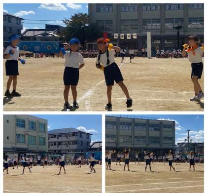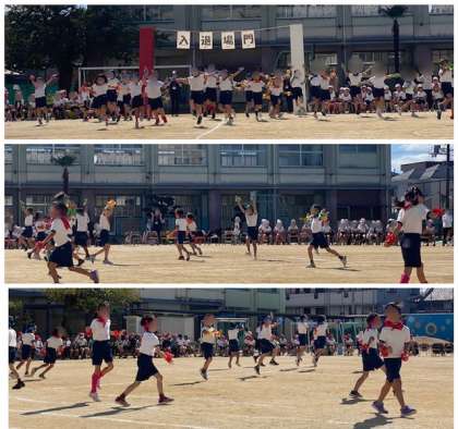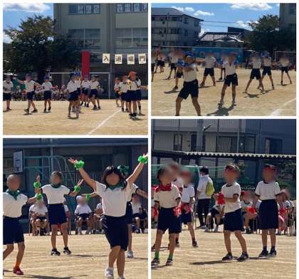 2年生は「さわげ 怪獣ダンス」を披露してくれました。バンダナやネッカチーフ、リストバンドもカラフルに、楽しくダンスしました。