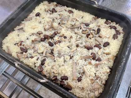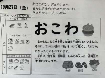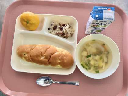 令和5年10月27日(金)の献立は「おさつパン・牛乳・金時豆の中華おこわ・中華スープ・みかん」です。