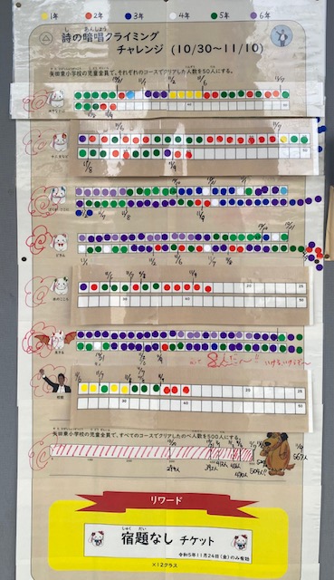 ※「大きなかぶ」は200人以上が合格、「十二支なと」も軽く100人ごえ、「水のこころ」は63人、「校歌」も100人をこえました。全てのコースをクリアしたのべ人数は567人以上でした。