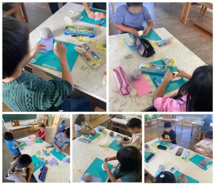 何が出来上がるのでしょうか、出来上がりが楽しみです。「紙粘土やわらか〜い」「絵の具はたくさん混ぜないと、色が出ない」「パンを作ってるみたいや」子どたちから口々に感想がでていました。