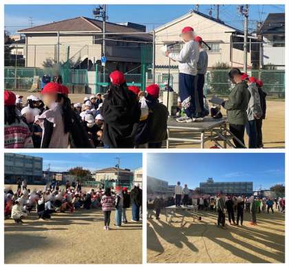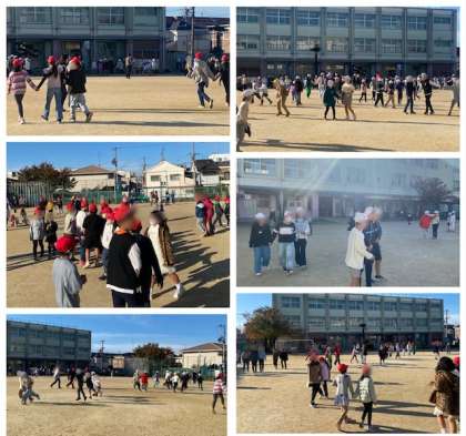 今朝は児童集会がありました。なかよし班全員で「手つなぎおにごっこ」をやりました。異学年のペアで手をつないで、運動場いっぱい使って楽しみました。