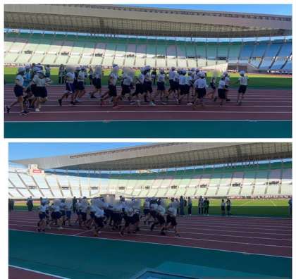 ウォーミングアップで、400mのトラックを一周していよいよ50m、100mの記録を測ります。