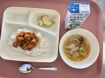 12月1日(金)の献立は「ケチャップライス・牛乳・スープ・じゃがいものバジル焼き」でした。