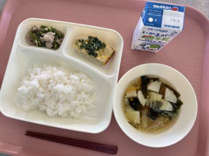 12月4日(月)の献立は「ごはん・牛乳・具だくさん卵の千草焼き・五目汁・豚肉とさんどまめのいためもの」でした。