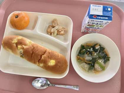 12月12日(火)の献立は「おさつパン・牛乳・さけのマリネ・肉だんごと麦のスープ・みかん」でした。