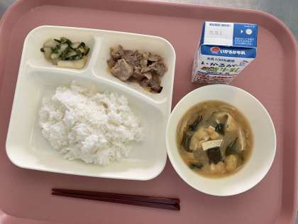 12月13日(水)の献立は「ごはん・牛乳・豚肉のねぎじょうゆ焼き・みそ汁・きくなとはくさいのごまあえ」でした。