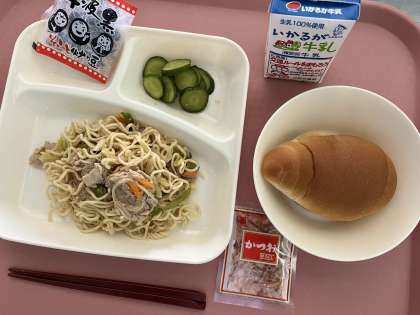 12月14日(木)の献立は「黒糖パン(小)・牛乳・和風焼きそば・きゅうりのしょうがづけ・いり黒豆」でした。