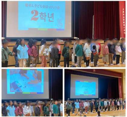 2年生はソムセンニムに教わった、韓国朝鮮の食文化などについて発表しました。最後は日本語、韓国語、ベトナム語などを使って「メッセージ」を歌いました。