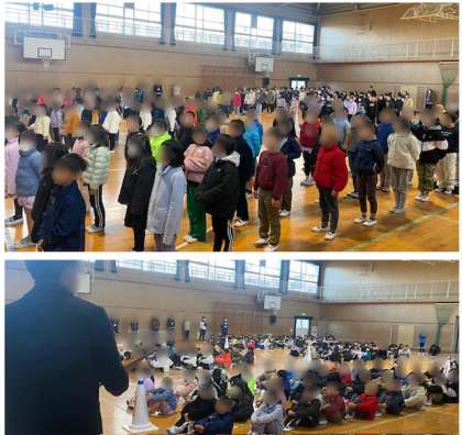 講堂に集まって校歌を歌って、校長先生の話を聞きました。