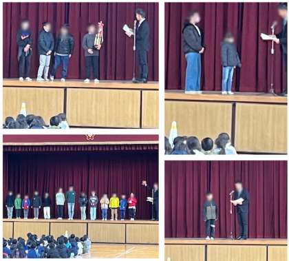表彰状やトロフィーをもらった人たちの紹介をしました。夏休みの絵画の賞や人権標語、サッカーチームは3位に、野球チームは優勝を、それぞれ表彰されたり、獲得したりしました。みんなとってもがんばりましたね。大きな拍手が講堂に響き渡りました。