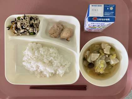 1月11日(木)の献立は「ごはん・牛乳・鶏肉の甘みそ焼き・五目汁・高野どうふのいり煮」でした。