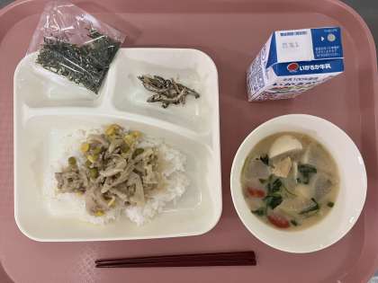 1月15日(月)の献立は、正月の行事献立の「れんこんのちらしずし・牛乳・ぞう煮・ごまめ」でした。