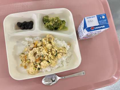 1月16日(火)の献立は「親子丼・牛乳・ブロッコリーのごまあえ・黒豆の煮もの」でした。