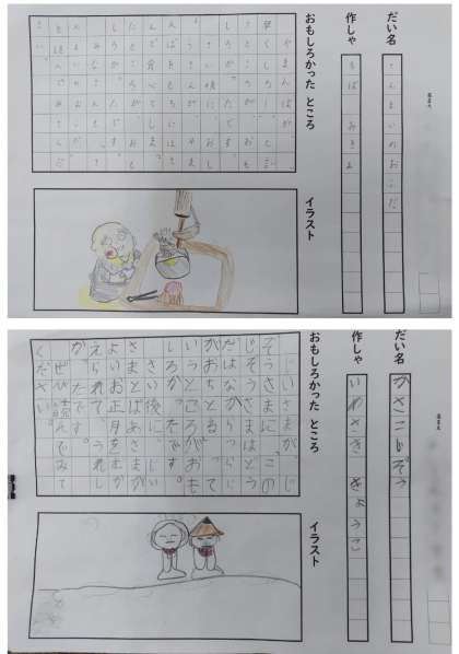 2年生の国語科では、昔話の紹介文を書いています。3文で書くという条件をつけていますが、子どもたちは頑張っています。