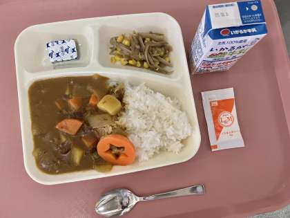 1月23日(火)の献立は「牛肉と金時豆のカレーライス・牛乳・ごぼうサラダ[ノンエッグドレッシング]・固形チーズ」でした。