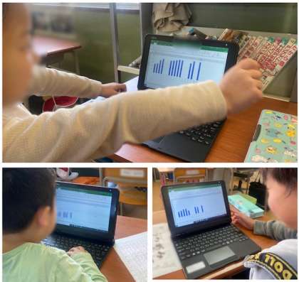 2年生は、かけ算の習熟で100マス計算に取り組んでいます。結果を自分で一人一台パソコンのエクセルに入力しています。棒グラフで表されるので自身の結果が「見える化」され、子どもたちにもモチベーションアップにつながっています。