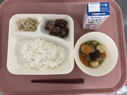 2月1日(木)の献立は「ごはん・牛乳・くじらのたつたあげ・まる天と野菜の煮もの・もやしのしょうがづけ」でした。